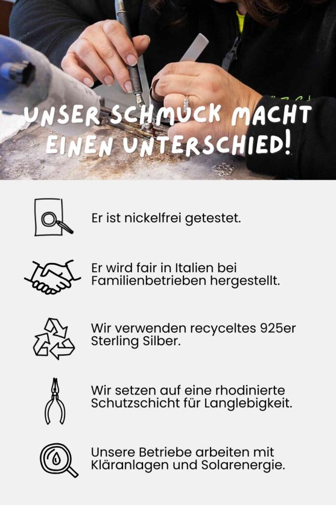 Dieses Schmuckstück besteht aus hochwertigem, recyceltem 925er Sterling Silber mit Rhodinierung – für besonders strahlenden Glanz und erhöhte Beständigkeit gegen Anlaufen. Im Gegensatz zu Modeschmuck aus Edelstahl oder Messing verwenden wir ausschließlich nachhaltig gewonnenes Silber, das sorgfältig verarbeitet wird, um langlebige, hochwertige Designs zu schaffen.